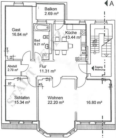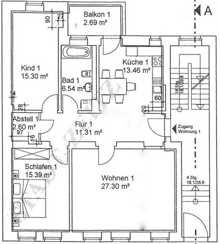 Dies ist der Grundriss der Wohnung im Erdgeschoss. Eine Besonderheit ist das besonders grosszügig geschnittene Wohnzimmer. |