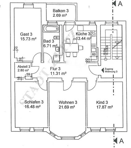 Dieser Grundriss zeigt die Variante mit drei Zimmern und offenem Wohn- Essbereich. Die Wohnung umfasst ca. 107qm. Wohnungen mit diesem Grundriss befinden sich im 1. und 2. Obergeschoss. |